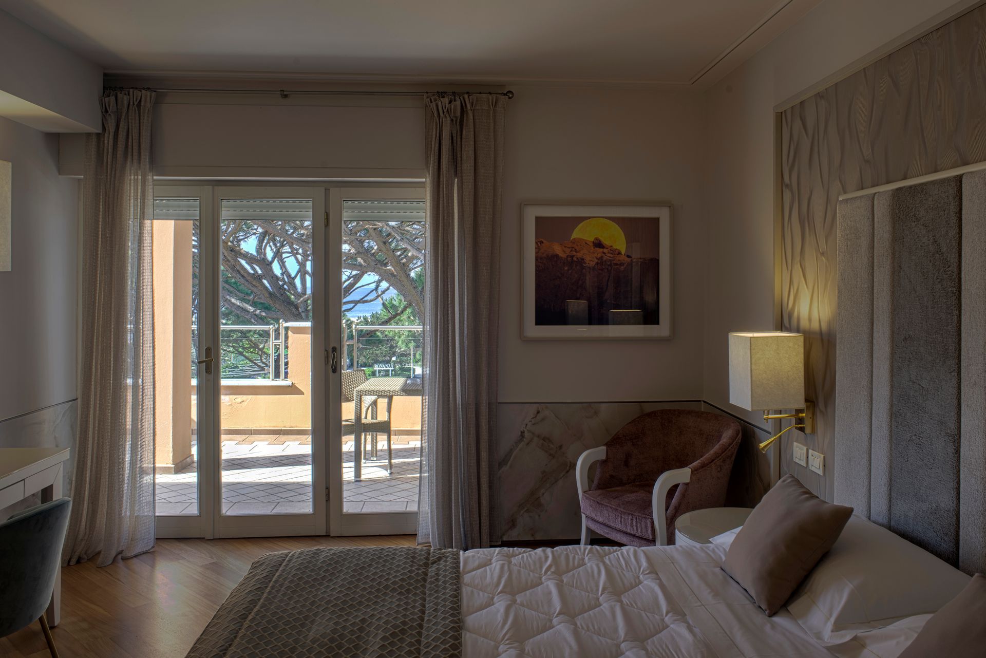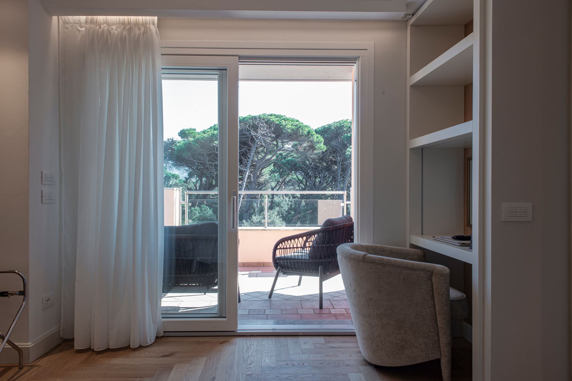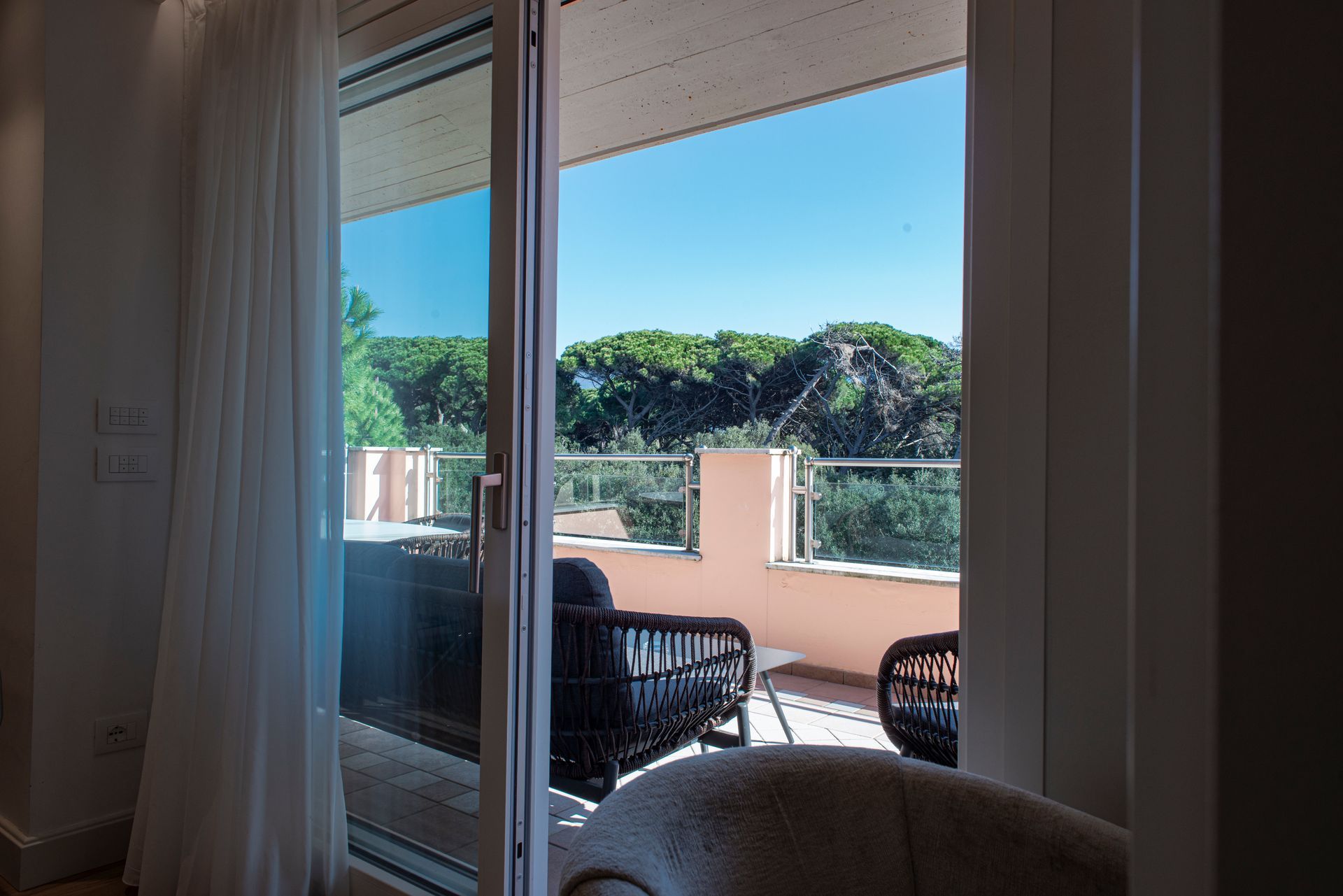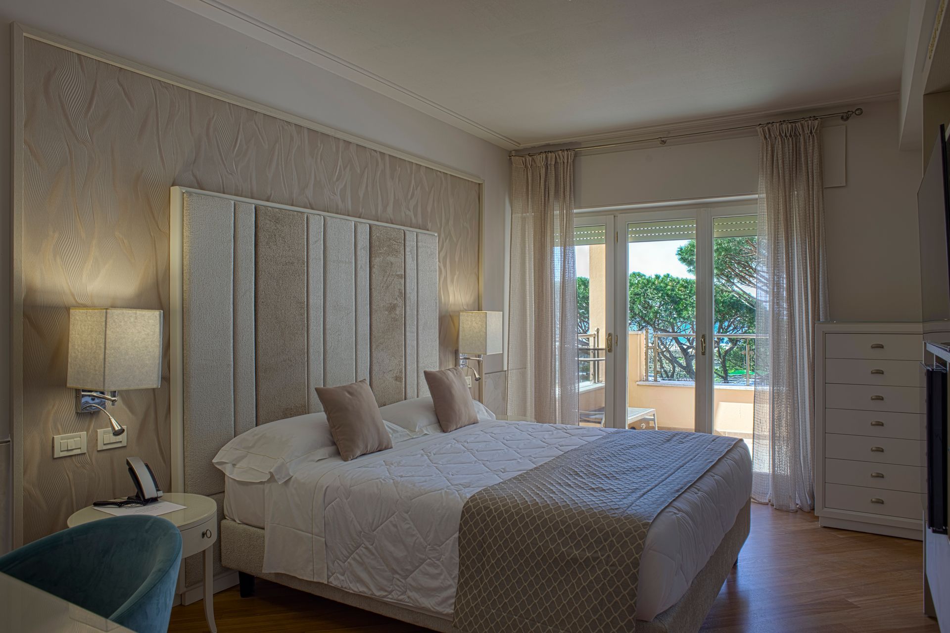 Camera con balcone attrezzato e vista sul verde Parco della Versiliana. Ambienti curati nel minimo particolare, accoglienti e arredati in stile moderno, perfetti per un rilassante soggiorno in Versilia, in coppia o con famiglia.