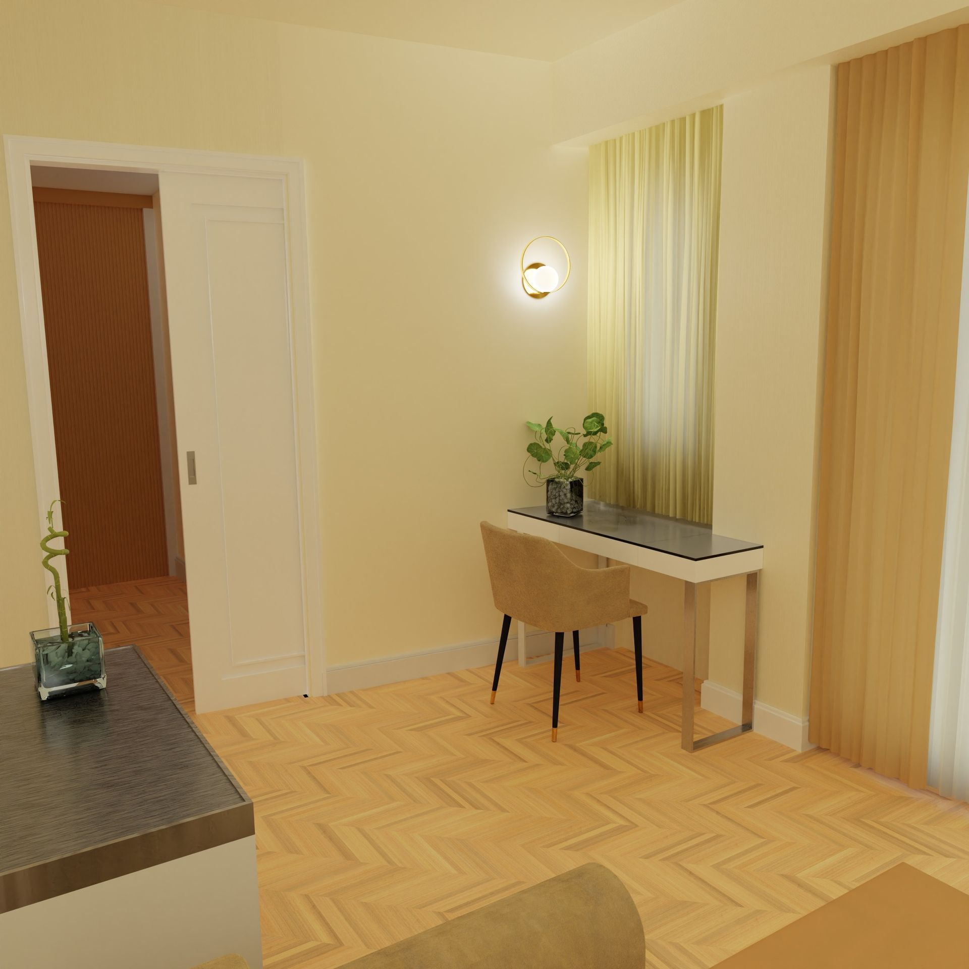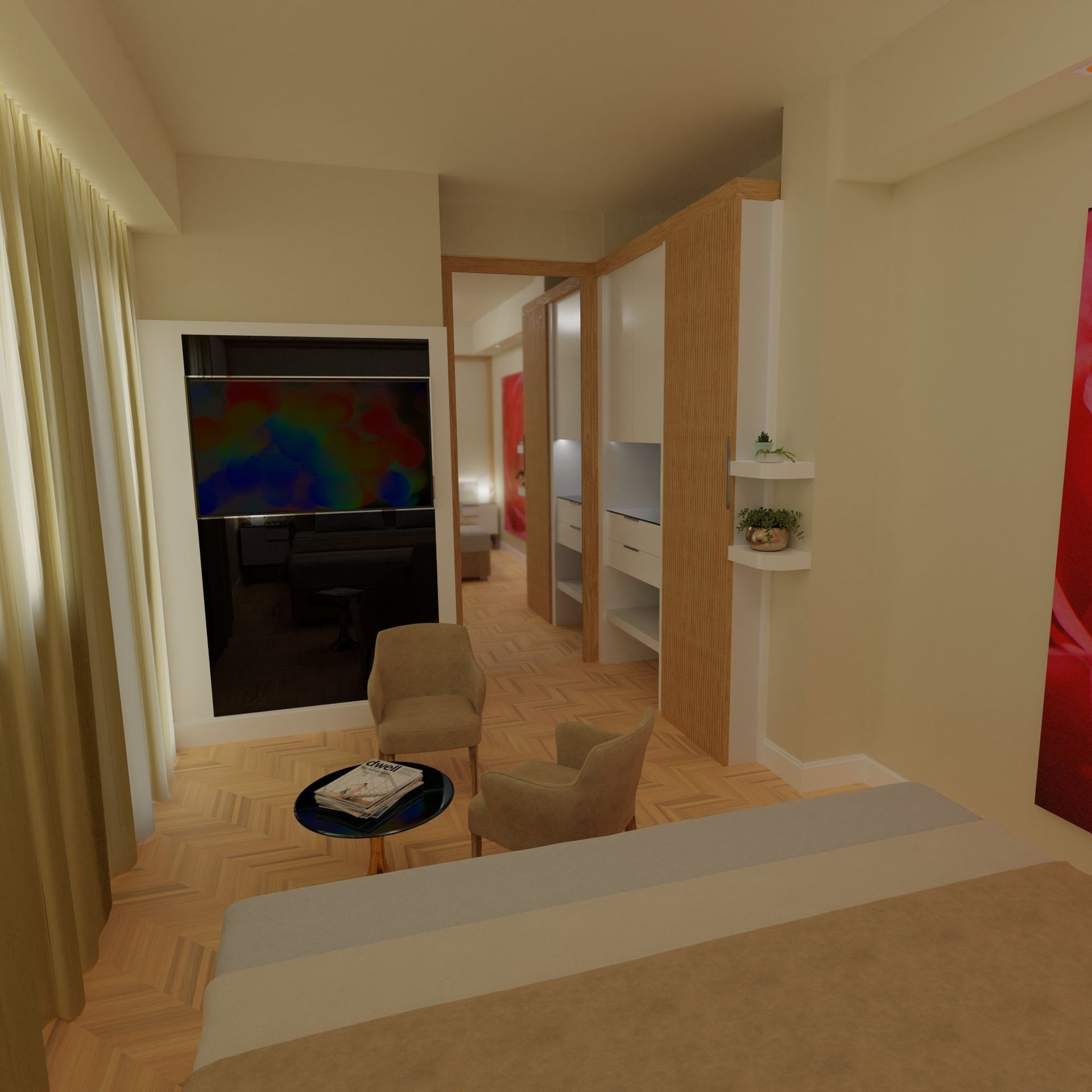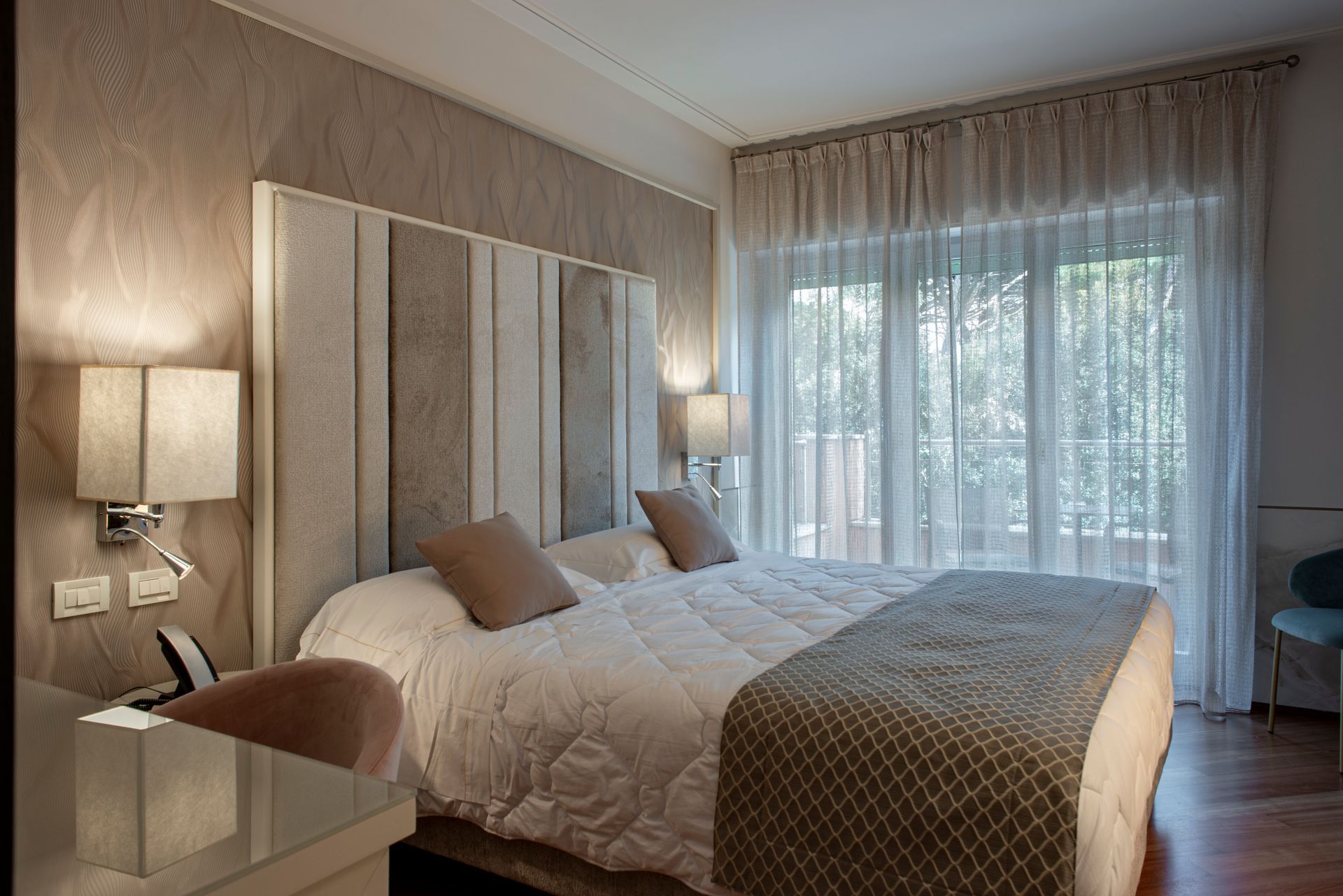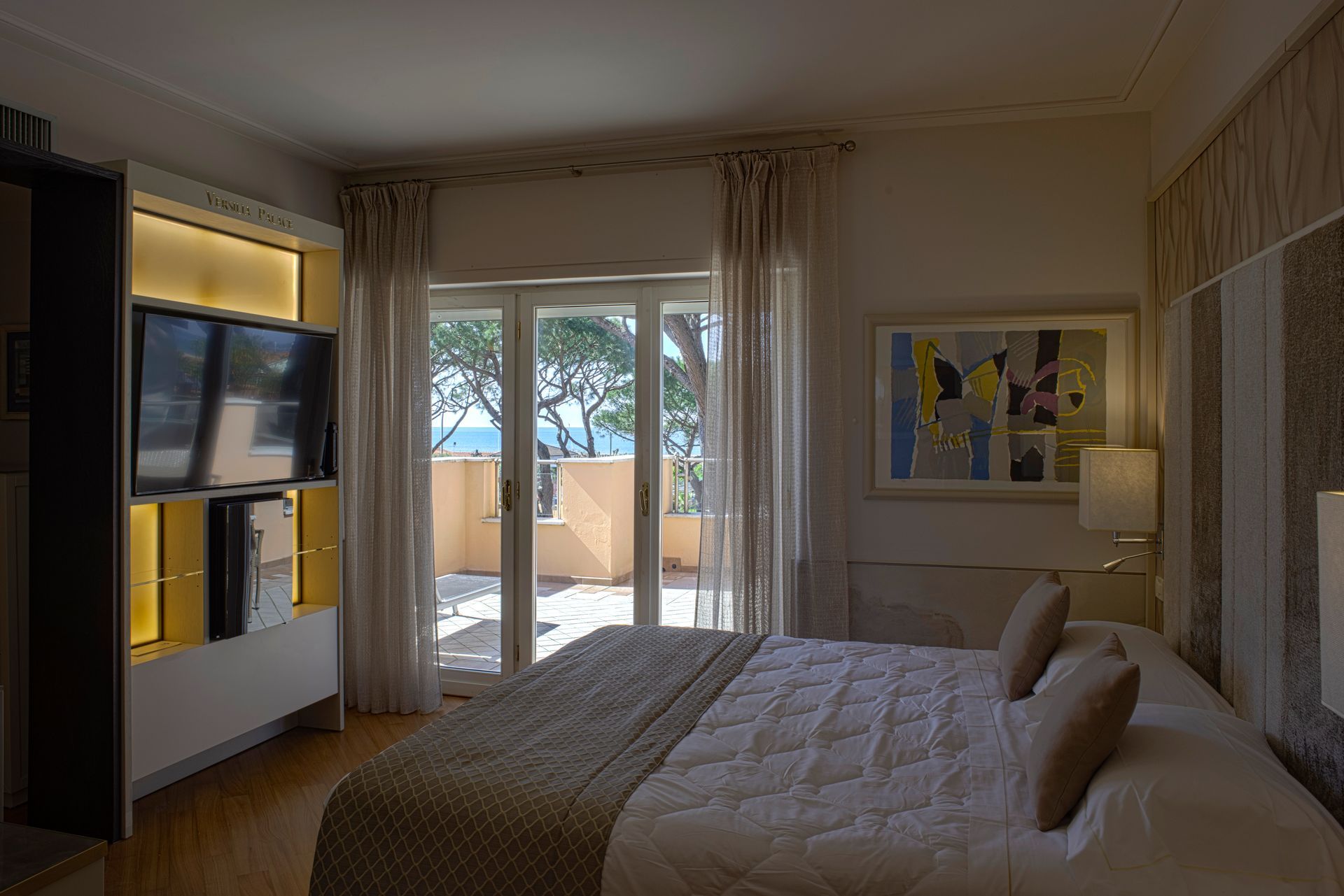 Camera con balcone attrezzato e vista sul verde Parco della Versiliana. Ambienti curati nel minimo particolare, accoglienti e arredati in stile moderno, perfetti per un rilassante soggiorno in Versilia, in coppia o con famiglia.