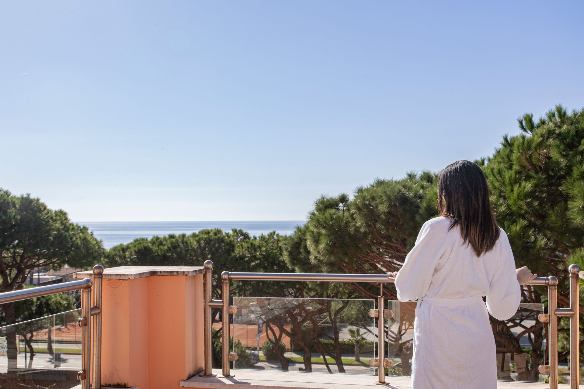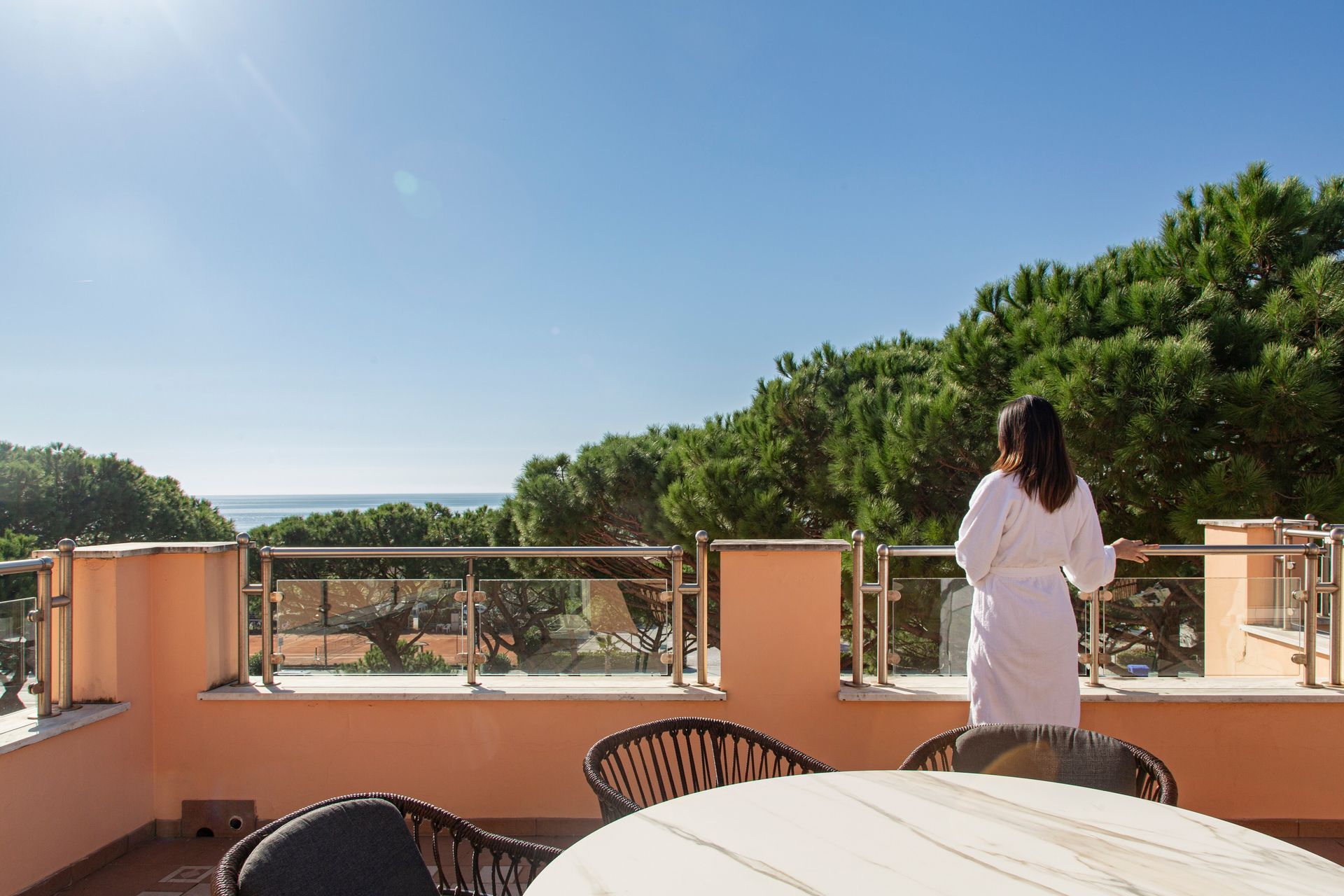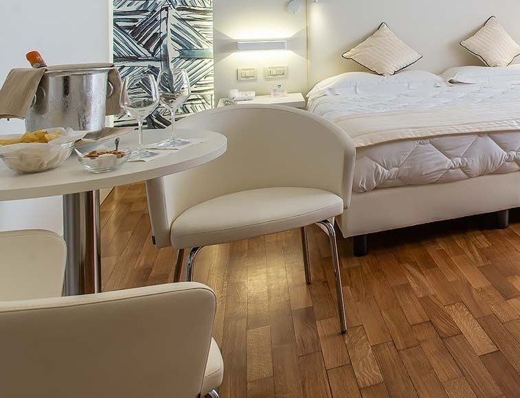 Esclusiva soluzione di soggiorno in splendida Suite con terrazzo attrezzato con suggestiva vista parco della Versiliana. Dotate di tutti i più moderni comfort, TV lcd e decoder SKY. Include accappatoio e ciabattine in spugna.