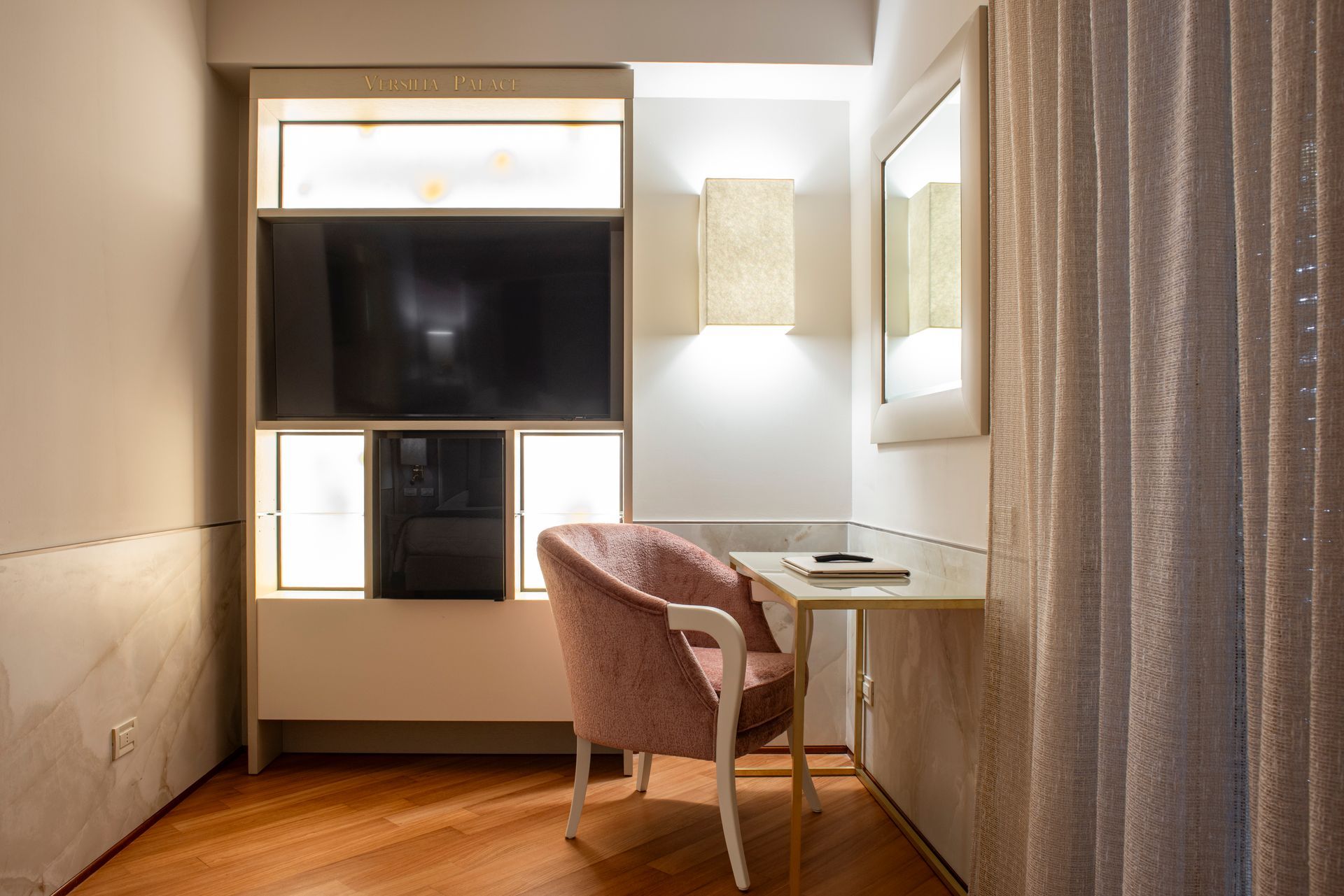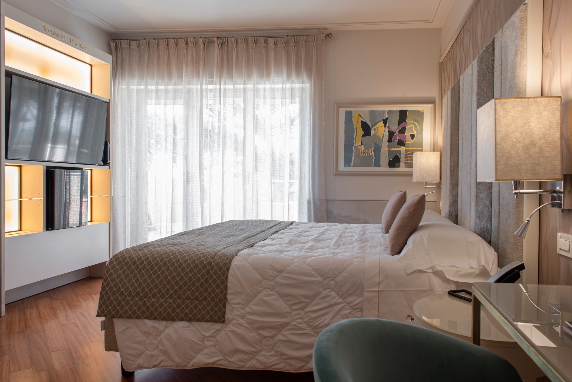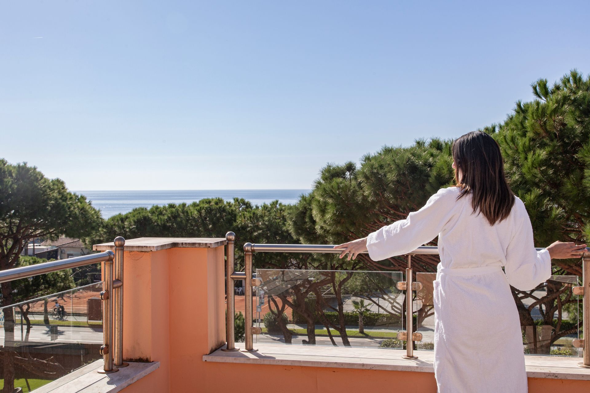 Esclusiva soluzione di soggiorno in splendida Suite con terrazzo attrezzato con suggestiva vista parco della Versiliana. Dotate di tutti i più moderni comfort, TV lcd e decoder SKY. Include accappatoio e ciabattine in spugna.